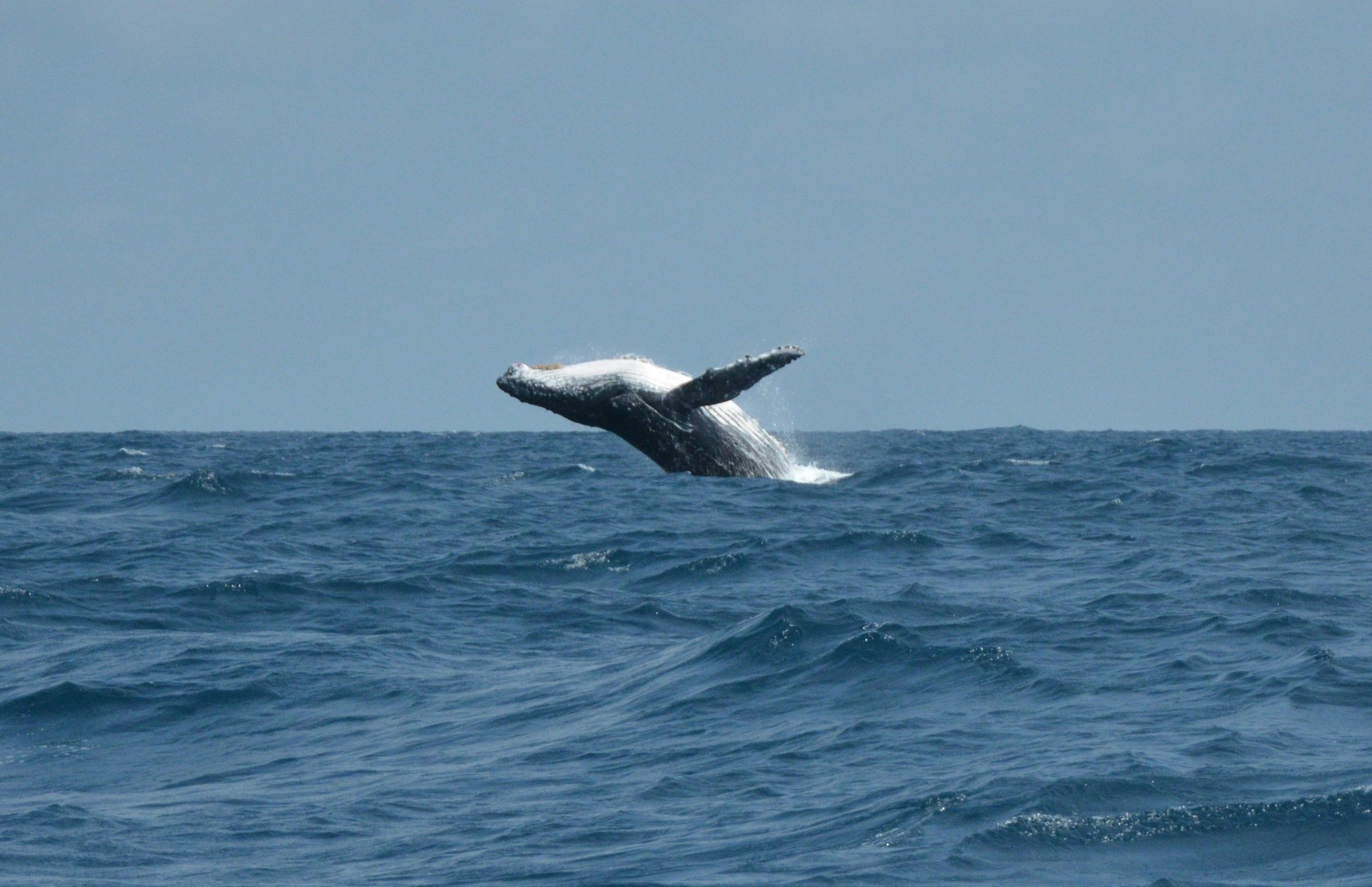 Breaching: The whale launches at least 40% of its body backwards out of the water, landing with a huge splash. They usually do this just for fun!